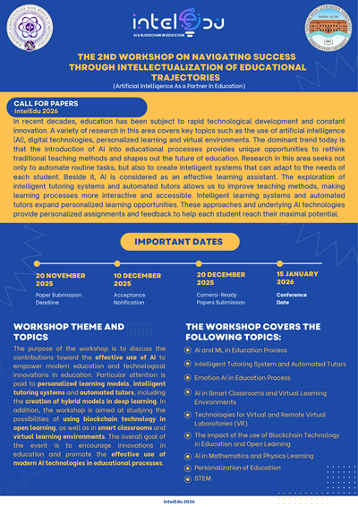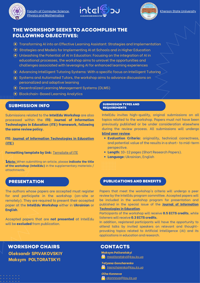Херсонський державний університет запрошує до участі у 2-му міжнародному воркшопі IntelEdu 2026 “Навігація успіху через інтелектуалізацію освітніх траєкторій”.