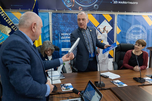 На знак вдячності перший проректор Сергій Омельчук подарував гостям видання “Херсонські есеї: жити, щоб перемагати” та «Чорний лебідь» в історії Херсонського державного університету, або Хроніки релокованого вишу».