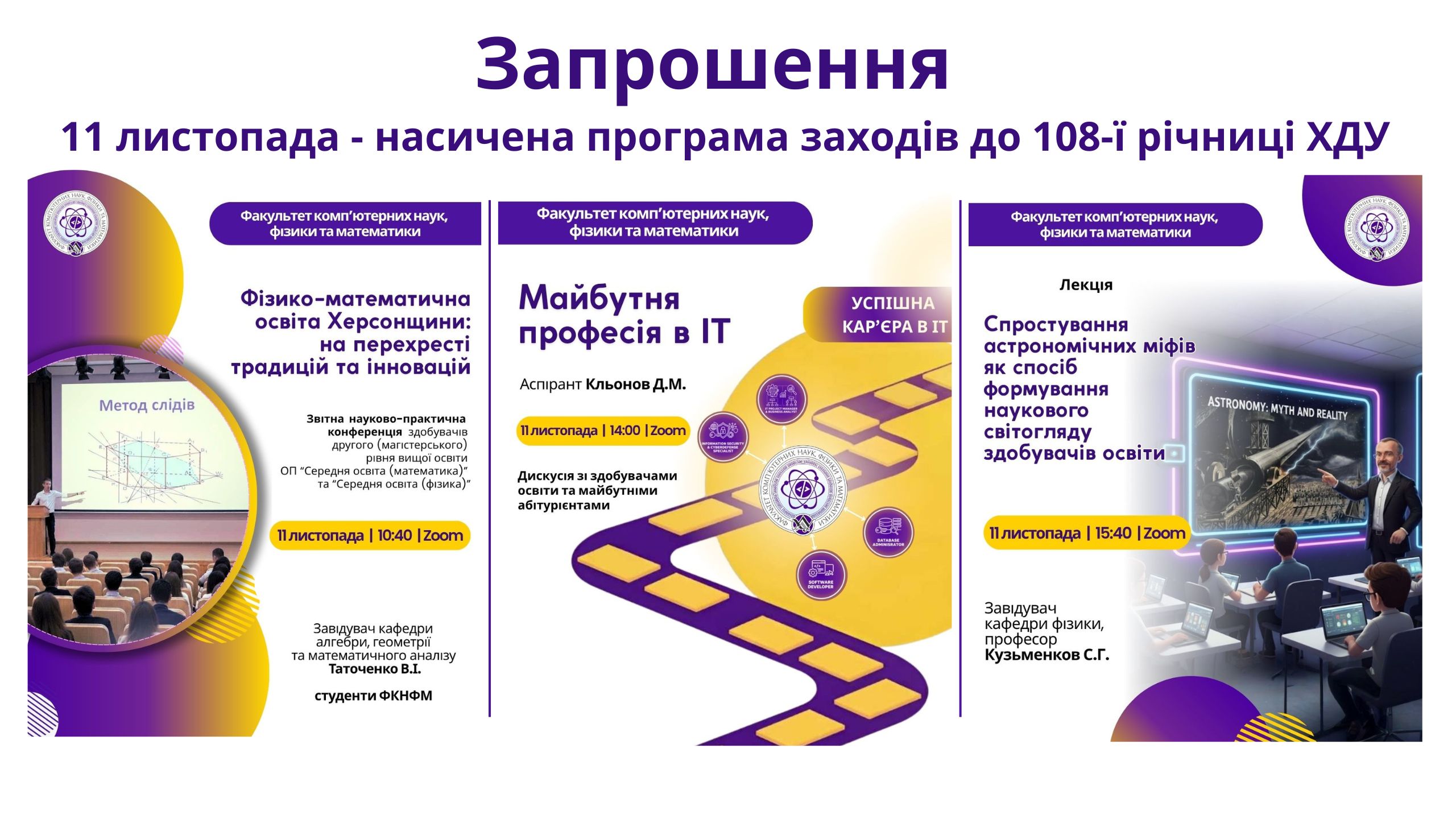 Факультет комп’ютерних наук, фізики та математики продовжує святкування 108-ї річниці Херсонського державного університету та запрошує студентів, викладачів і майбутніх абітурієнтів долучитися до низки цікавих заходів, що відбудуться у вівторок, 11 листопада.
