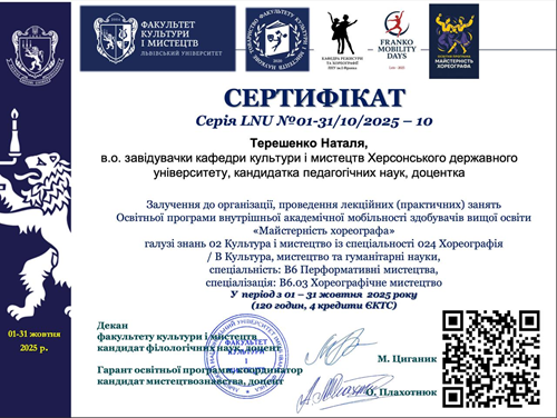 Упродовж жовтня в.о. завідувачки кафедри культури і мистецтв Херсонського державного університету Наталя Терешенко була залучена до організації та проведення лекційних і практичних занять за Освітньою програмою внутрішньої академічної мобільності “Майстерність хореографа” (галузь знань 02 «Культура і мистецтво», спеціальність 024 «Хореографія»).