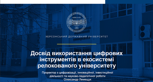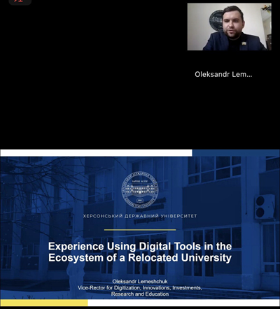 Проректор з цифровізації Херсонського державного університету Олександр Лемещук представив досвід використання цифрових інструментів в екосистемі релокованого університету. Звичайно, що на прикладі ХДУ.