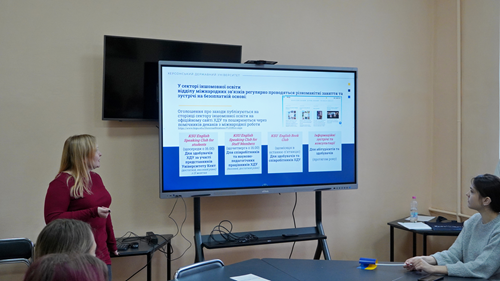 Фахівчиня Офісу іншомовної освіти Олена Ставенко акцентувала увагу на важливості мовної підготовки та представила платні й безкоштовні курси з вивчення іноземних мов, які допомагають студентам успішно складати міжнародні іспити та впевнено почуватися під час навчання за кордоном.