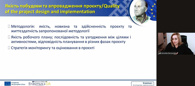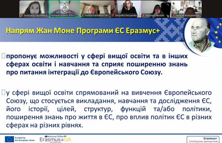 Консультація, організована в онлайн-форматі, була присвячена можливостям участі університету в програмах Erasmus+, зокрема в модулях та кафедрах Jean Monnet, а також у конкурсах Еразмус КА2. На слайдах, презентованих під час зустрічі фахівцем відділу Євгеном Анатолійовичем Бобровим учасники могли побачити ключові напрями роботи, вимоги до заявок такого типу, аналіз попередніх заявок та потенціал співпраці в межах європейських освітніх ініціатив.