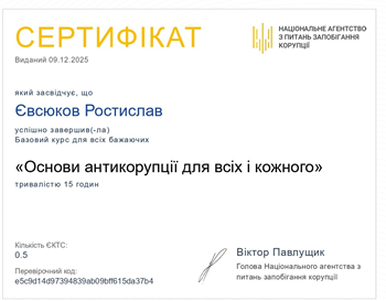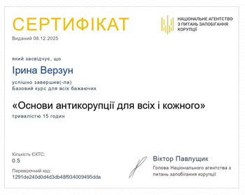 З метою аналізу рівня обізнаності та ставлення до антикорупційних стандартів у нашій спільноті університет запросив здобувачів освіти пройти анонімне опитування. ХДУ запропонував студентам пройти доступний безкоштовний онлайн-курс з основ антикорупційної діяльності на порталі НАЗК, який дає можливість отримати не тільки сертифікат, а також нові знання про ефективні механізми протидії корупції.Студенти кафедри Філософії, соціології та соціальної роботи Верзун Ірина та Євсюков Ростислав долучились до події, пройшли пізнавальний онлайн-курс та отримали сертифікати.Активна позиція кожного з нас – це ключ до доброчесного суспільства!