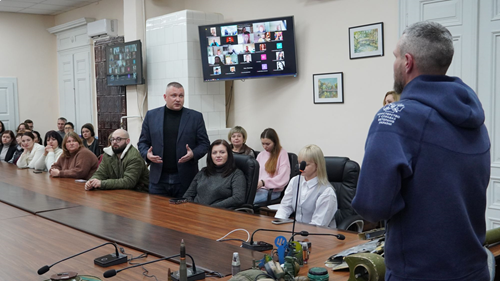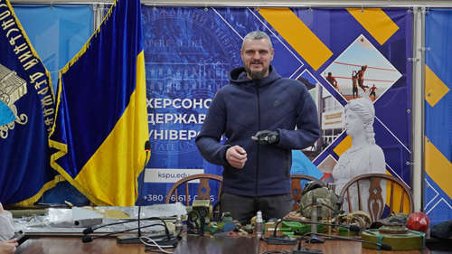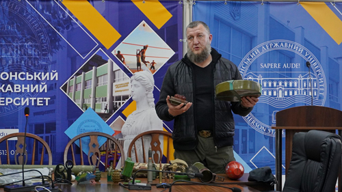 Ветеран російсько-української війни Володимир Козак поділився власним бойовим досвідом і детально розповів про мінно-вибухові предмети. Під час виступу він наочно продемонстрував різні види мін, пояснив їхню небезпеку та наголосив на важливості обережності й неухильного дотримання правил безпеки.