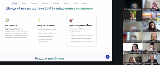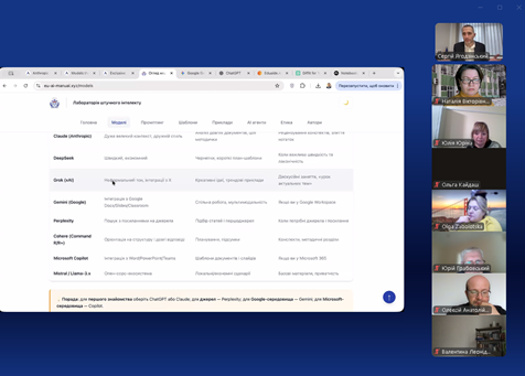У межах зустрічі йшлося про AI-інструменти в роботі викладача, зокрема було представлено огляд сучасних моделей та практичних додатків — DiffitEduaide.AINotebookLM, а також можливості використання AI-асистентів на базі ChatGPTs.
