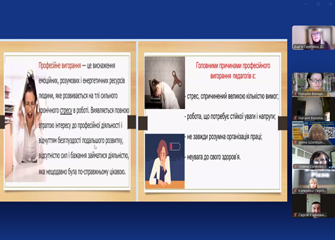 Під час заняття учасники працювали з темами професійного виснаження, усвідомлення власного емоційного стану та пошуку внутрішніх ресурсів в умовах постійної зайнятості. Програма тренінгу передбачала проходження тестів на рівень стресу, а також інтерактивні вправи та активності, спрямовані на підтримку психологічної стійкості й саморефлексії.