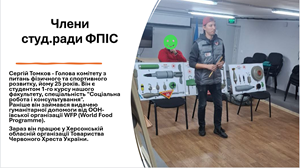 Голова студентської ради факультету та здобувач 3 курсу ЄВСЮКОВ Ростислав поділився інформацією про те, як студенти вже під час навчання залучаються до надання соціально-психологічної допомоги населенню та займаються волонтерством.
