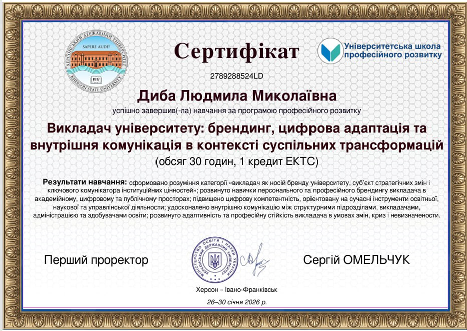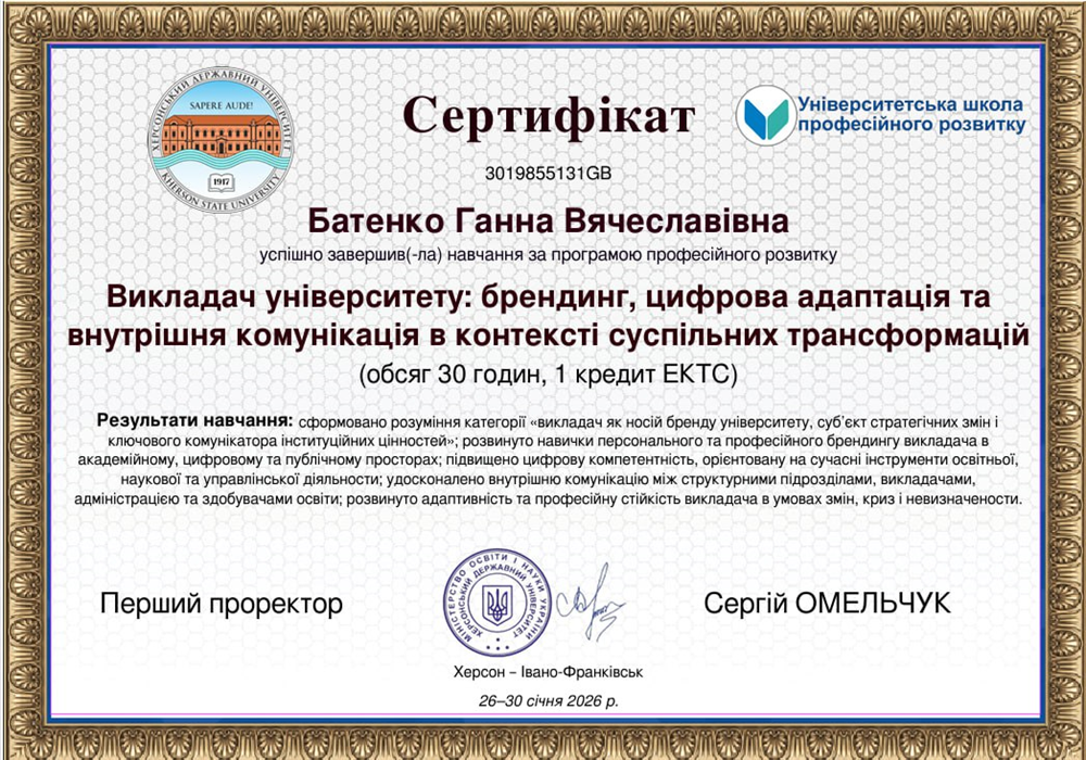 Щиро дякуємо організаторам Університетської школи професійного розвитку Херсонського державного університету за надану можливість долучитися та успішно пройти курс «Викладач університету: брендинг, цифрова адаптація та внутрішня комунікація в контексті суспільних трансформацій».Отримані знання та практичні інструменти сприятимуть подальшому професійному розвитку викладачів, упровадженню сучасних освітніх підходів і посиленню ефективної комунікації в академічному середовищі.