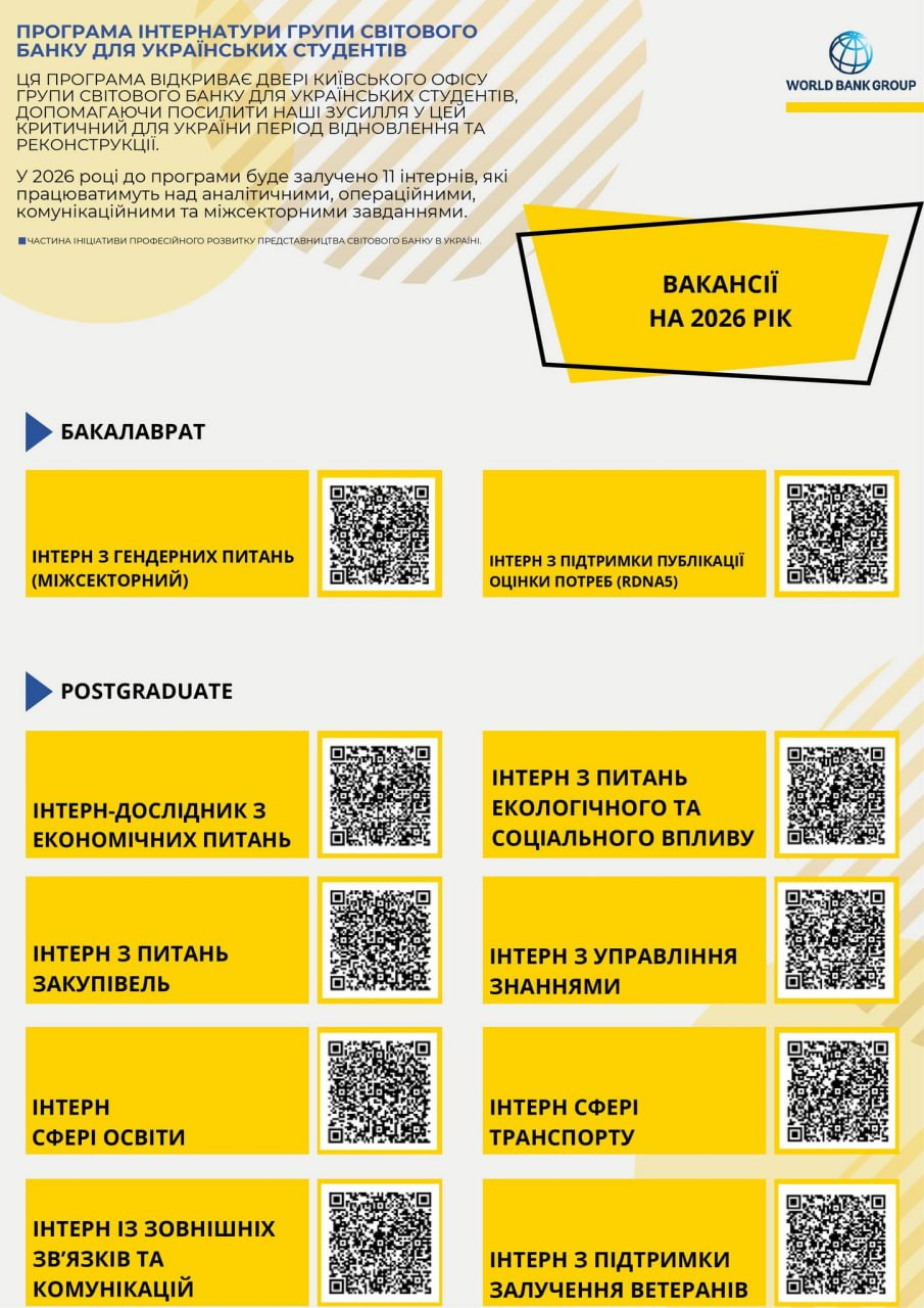 📣Світовий банк запрошує українських студентів в офіс у Києві на програму стажування FY26 ONE WBG Internship Program — єдиний набір із 11 стажерів у різних сферах для проведення аналітики, аналізу операцій, комунікацій та міжгалузевих пріоритетів.