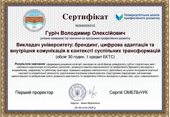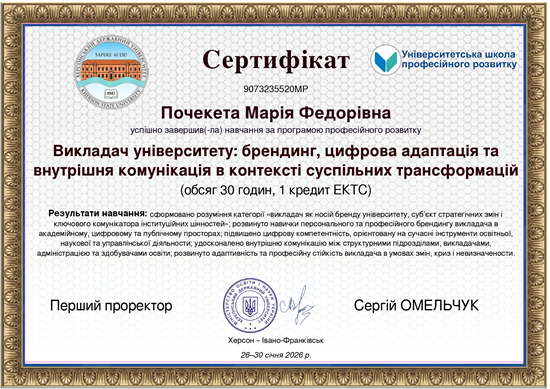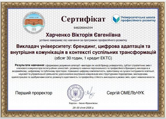 З 26 по 30 січня у ХДУ тривала робота чергової школи професійного розвитку, яка включала в себе тренінги, лекції та воркшопи. Члени кафедри психології успішно пройшли навчання та отримали сертифікати з курсу «Викладач університету: брендинг, цифрова адаптація та внутрішня комунікація в контексті суспільних трансформацій».Загалом відбулося 14 активностей, спікерами яких були як представники ХДУ, так і запрошені спікери.