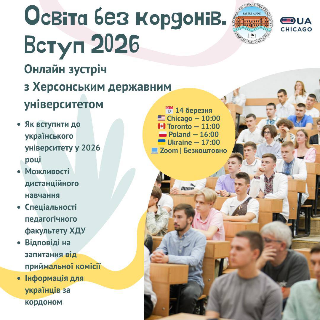 Педагогічний факультет Херсонського державного університету запрошує майбутніх абітурієнтів та їхніх батьків на онлайн-зустріч, організовану спільно з Українським освітнім хабом у Чикаго.