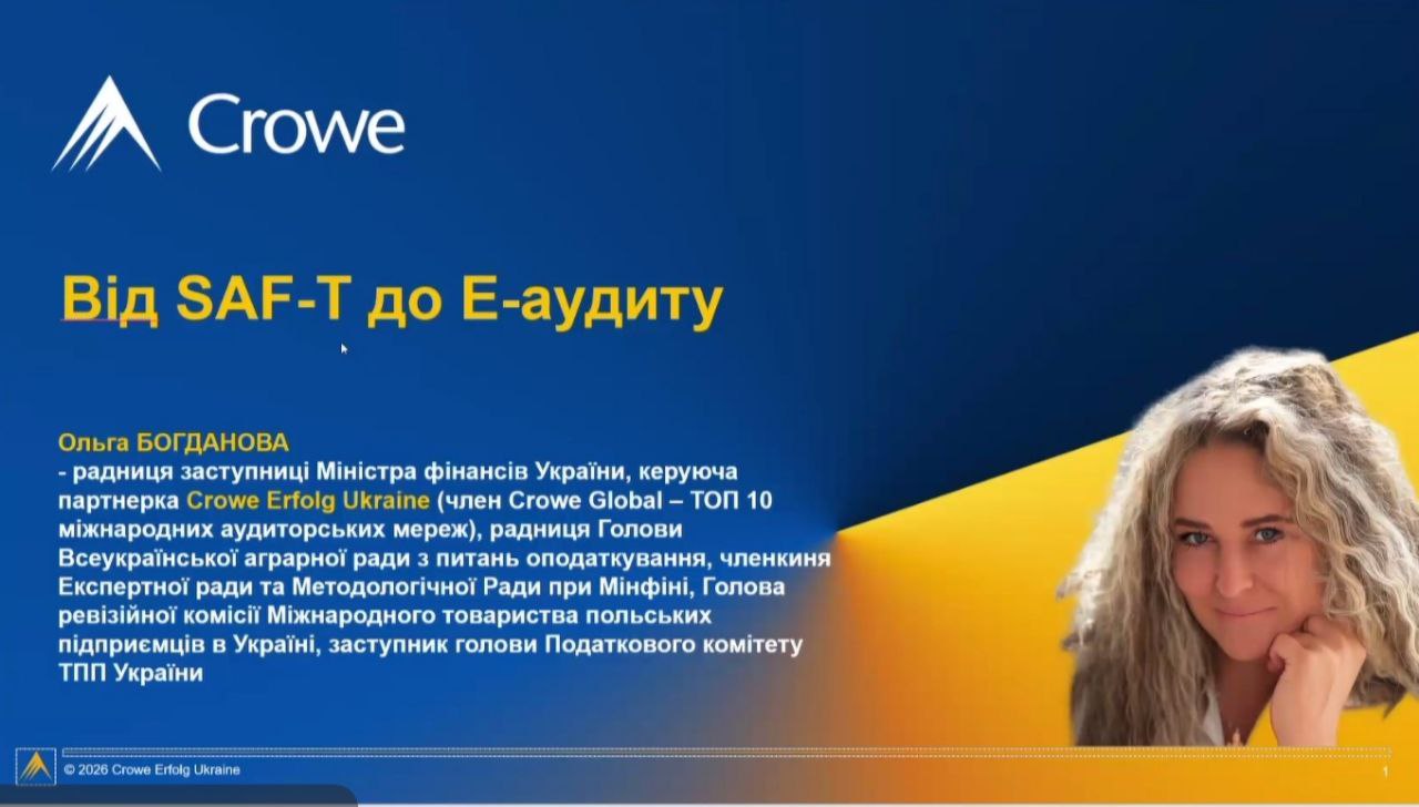 🔹 Ольга Богданова – радниця заступниці Міністра фінансів України, керуюча партнерка CroweErfolg Ukraine (мережа Crowe Global – ТОП-10 міжнародних аудиторських мереж) – представила виступ на тему «Від SAF-T до Е-аудиту», у якому розкрила сучасні тенденції цифровізації податкового контролю та перспективи впровадження електронного аудиту в Україні.