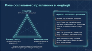 Обрана тема лекції «Від конфлікту до порозуміння: медіація в соціальній роботі» викликала зацікавлення і в здобувачів освіти, і у викладачів обох кафедр. Лекторка детально розкрила природу конфлікту, одетально охарактеризувала стратегії виходу з кризових ситуацій, серед яких виділяють конкуренцію, пристосування, ухилення, компроміс та найбільш ефективну – співпрацю. Лекційний матеріал дав можливість для слухачів розкрити посередництво (медіацію) як ключову технологію та соціальну послугу. У підсумку лекторка наголосила, що медіація в соціальній роботі – це приклад гуманізації підходів у роботі з вразливими категоріями населення, бо саме медіація базується на принципах добровільності, конфіденційності та поваги до прав людини, що відповідає головній меті соціальної роботи.
