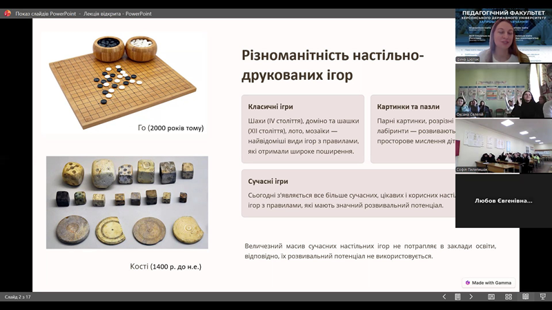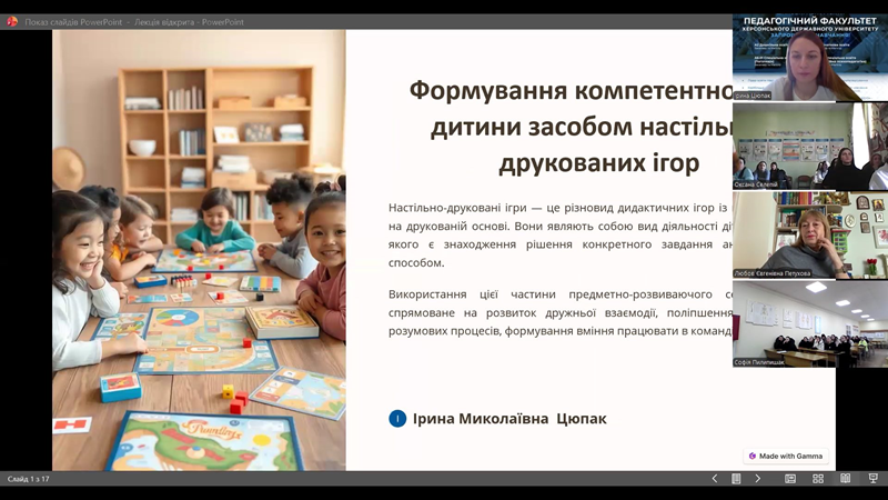 Сьогодні 27.02.2026 року для студентів спеціальності «Дошкільна освіта» Івано-Франківського фахового коледжу Карпатського національного університету імені Василя Стефаника було проведено гостьову лекцію на тему: «Формування компетентностей дитини засобом настільно-друкованих ігор». Спікер заходу Цюпак Ірина Миколаївна, викладачка кафедри педагогіки та психології дошкільної та початкової освіти Херсонського державного університету, представила майбутнім вихователям сучасний погляд на класичний інструментарій.