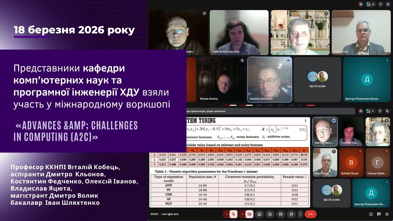 18 березня 2026 року відбулася чергова зустріч у межах Міжнародного воркшопу «Advances & Challenges in Computing (A2C)». Захід пройшов в онлайн-форматі та об'єднав провідних науковців і молодих дослідників для обговорення найсучасніших досягнень у галузі комп’ютингу.
