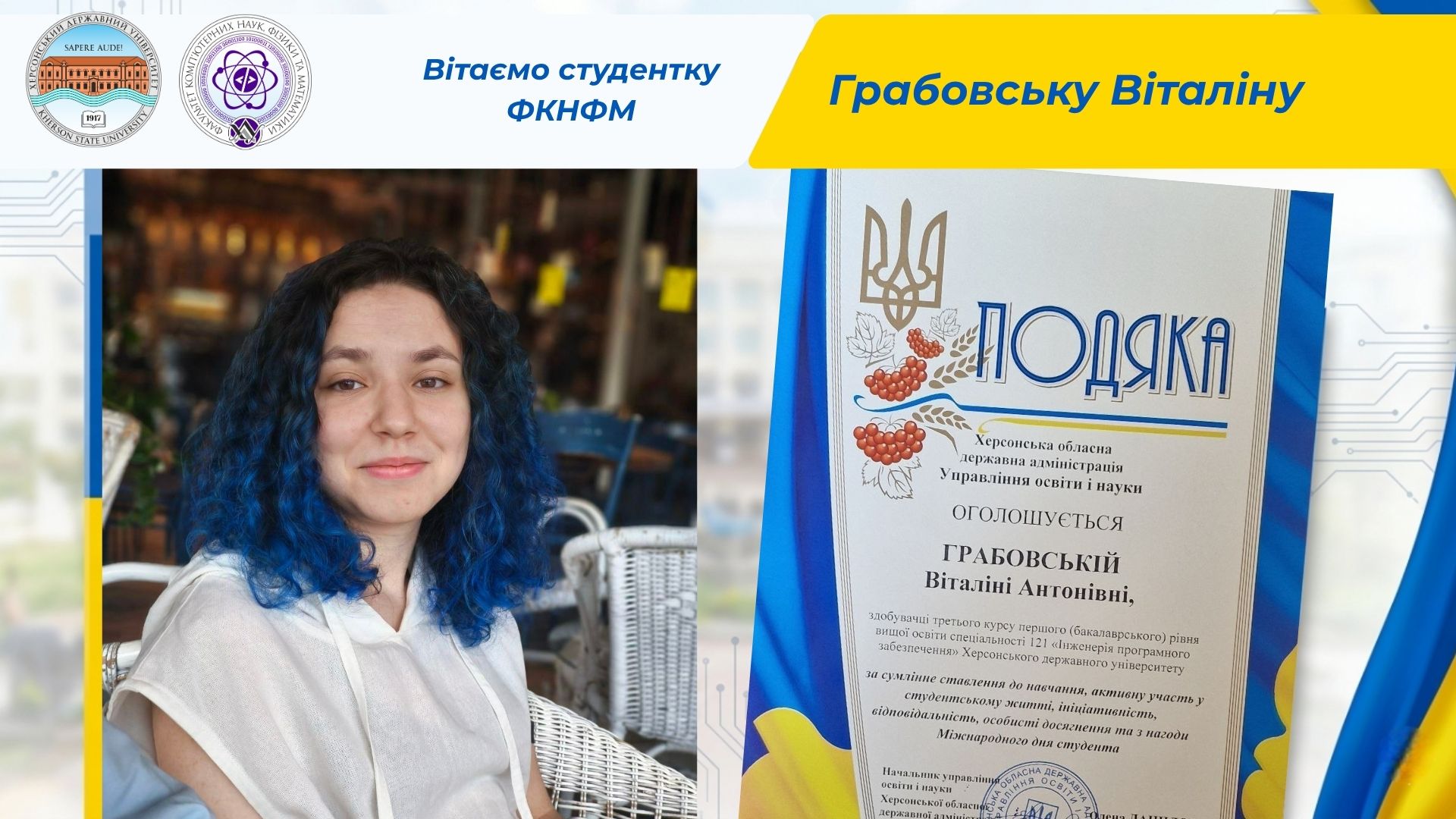 Здобувачку 3 курсу першого (бакалаврського) рівня вищої освіти спеціальністю «121 Інженерія програмного забезпечення» Грабовську Віталіну відзначено Подякою від Управління освіти і науки Херсонської обласної державної адміністрації за сумлінне ставлення до навчання, активну участь у студентському житті, ініціативність, відповідальність, особисті досягнення та з нагоди Міжнародного дня студента.