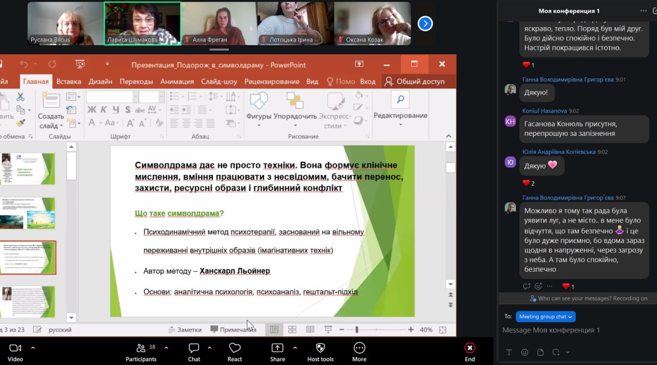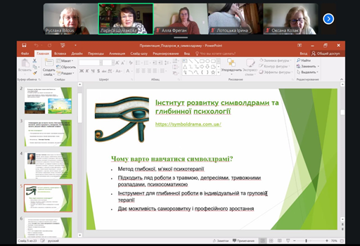 13.04.2026 р. для здобувачів першого (бакалаврського) та другого (магістерського) рівнів вищої освіти ОП «Психологія» була проведена відкрита лекція-майстер-клас: «Від теорії до практики: як образ допомагає працювати з внутрішнім світом клієнта, діагностика та терапія», присвячена можливостям навчання за психотерапевтичним методом символдрами (кататимно-імагінативної психотерапії). Лектори: Фреган Алла Володимирівна (керівник закарпатського осередку ІРСГП); Шумакова Лариса Павлівна (керівник херсонського осередку ІРСГП), психотерапевти за методом катативно-імагінативної психотерапії (символдрама), викладачі  Інституту розвитку символдрами і глибинної психології (ІРСГП), Міжнародного товариства катативно-імагінативної психотерапії (МТКІП).