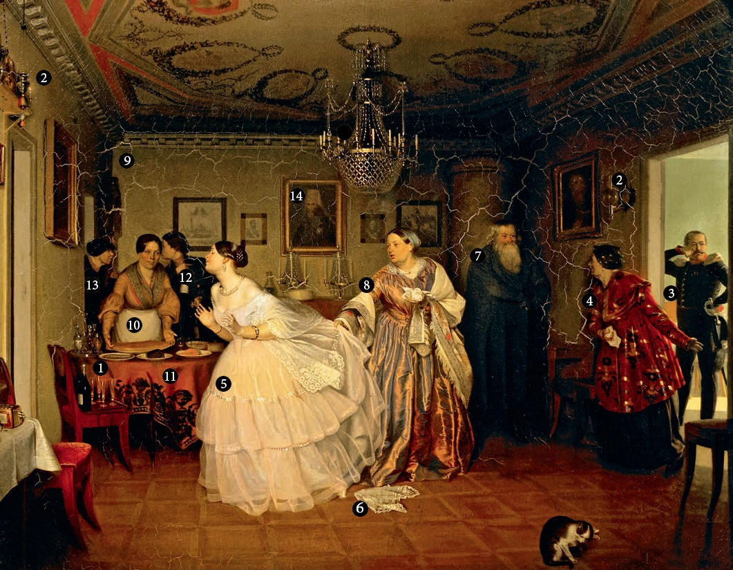 3. МАЙОР. Женитьбой тот решил поправить свое материальное положение. По мнению искусствоведа Ольги Киреевой, скорее всего, герой картины не потомственный дворянин, а получил дворянское звание по выслуге вместе с эполетами майора. Майор явно не знаком с правилами дворянского этикета – он явился без положенных букетов для невесты и ее матери.