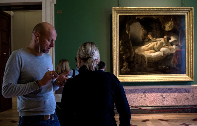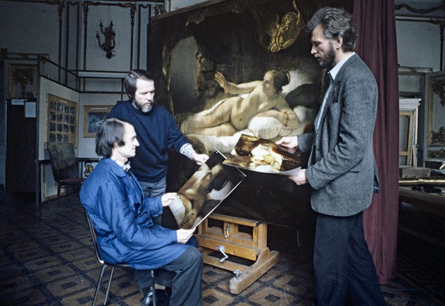 Группа реставраторов Государственного Эрмитажа во время работы по восстановлению картины Рембрандта «Даная».