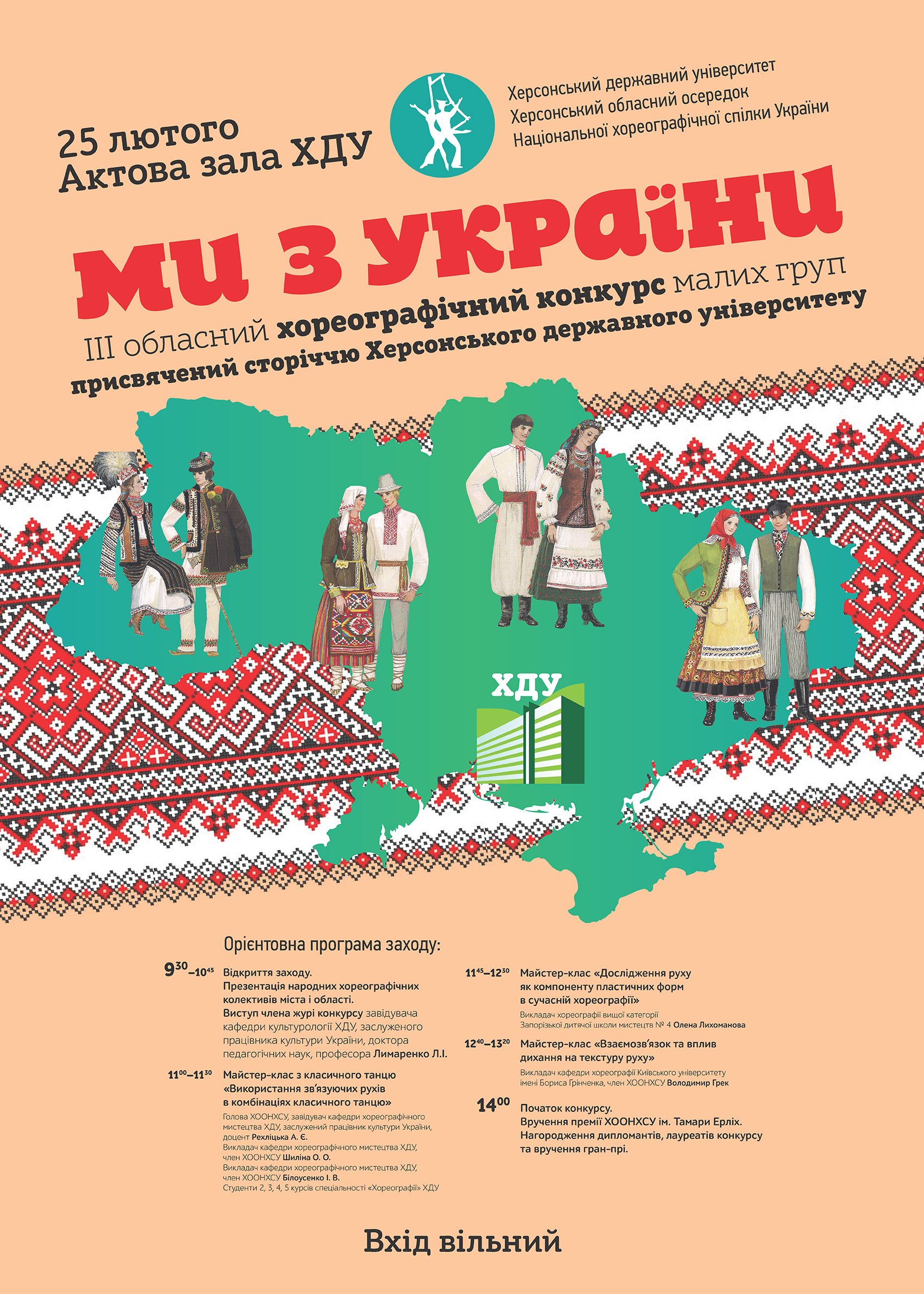 25 лютого 2017 року запрошуємо на ІІІ обласний хореографічний конкурс малих груп «МИ З УКРАЇНИ», присвячений сторіччю Херсонського державного університету!
